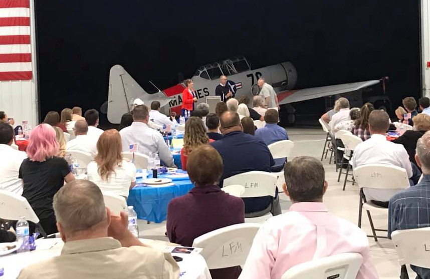 Giddings’ remarks were highlighted with a special back-drop – an actual working model of the T6 fighter plane. Giddings’ had received military training on a newer version of the T6.
