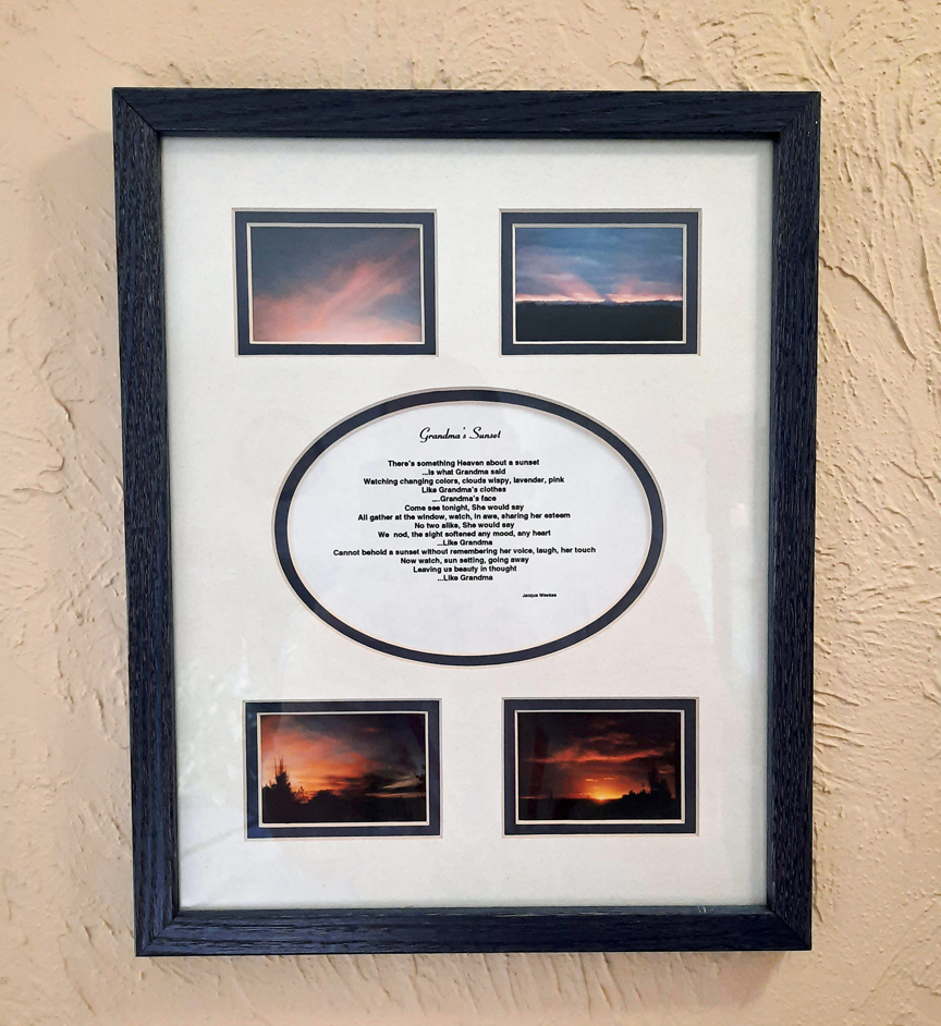 So what about “Grandma’s Sunset” you ask? That’s where I started. That’s where I will finish. In honor of my Mom, my wife Jacque wrote a poem called “Grandma’s Sunset.” Jacque took pictures from the very same spot where my Mom, our children’s Grandma Weekes, had stood to silently marvel at the sunsets she saw each evening six months earlier. If you come to our home, one of the first things you will see is one of the two photo montages that Jacque made, along with the poem. The other is hanging on a wall in my sister Nancy’s home in West Jordan.