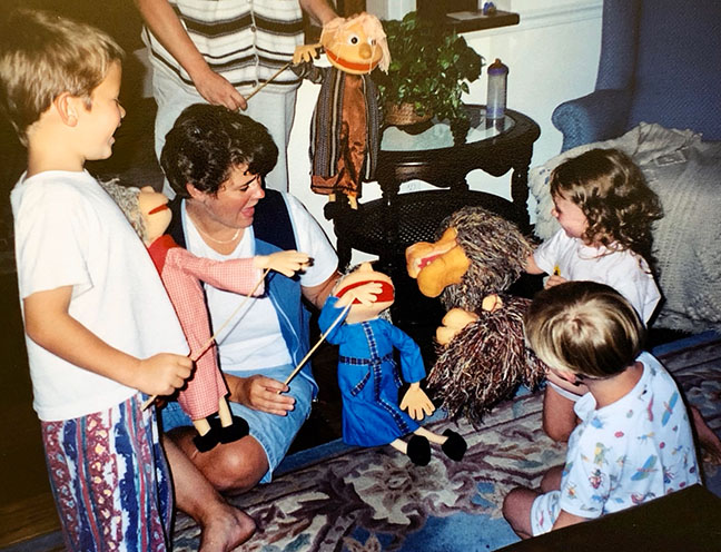 When her children were young, she loved sharing family history stories with flannel boards, using cutouts of the characters to bring those stories to life. She remembers many puppet shows with her kids using a baby blanket thrown over a curtain rod to set the stage. Now, when she’s with her grandchildren, the family often gathers around to hear stories told through puppets.
