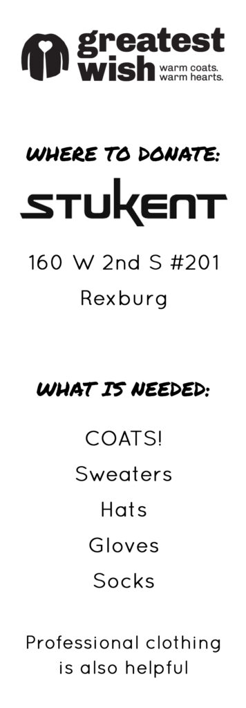 The distribution will take place next week, and donations are welcome. Those who would like to donate can take their donations to Stukent at 160 W 2nd S #201, at Hemming Village in Rexburg. Stukent has generously offered to accept donations any time.