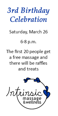 Jeanette, Chris, and the Intrinsic Massage staff invite you to join them on Saturday, March 26th to celebrate the company’s third birthday and the progress made on the remodeling. The event goes from 6-8 p.m. The first 20 people get a free massage and there will be raffles, treats, and an overall good time!